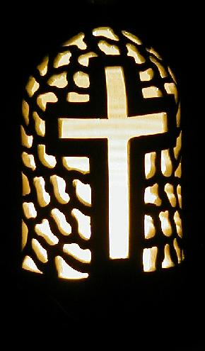 The Block Cross Bottle Luminary has a single panel with the block cross on the front of it.