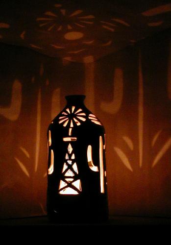 The Windmill Bottle Luminary has a windmill on the front and then cactus and Yucca plants (see cactus and Birds Luminary at top of the Bottle page) the rest of the way around, however I have done it with the state of Texas (see the Texas Luminary) on the back.