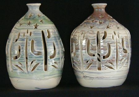 The Cactus and Stars Rounded Luminariy has cactus and yucca plants carved all the way around the luminary and stars carved all of the way around the top to give you stars on the ceiling owhen lit.